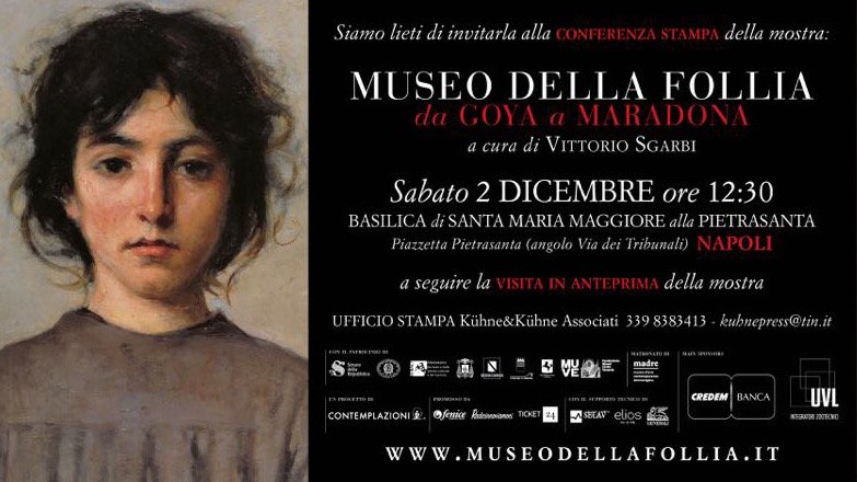 5 Dicembre 2017 | Basilica di Santa Maria Maggiore alla Pietrasanta Napoli 3 dicembre 2017 – 27 maggio 2018 Arriva a Napoli, nella ritrovata Basilica di Santa Maria Maggiore alla Pietrasanta, la nuova attesissima edizione del “Museo della Follia. Da Goya a Maradona”. La mostra itinerante – a cura di Vittorio Sgarbi, realizzata da Cesare Inzerillo, Giovanni Lettini, Stefano Morelli e Sara Pallavicini - si snoda in un percorso eterogeneo di oltre 200 opere tra dipinti, fotografie, sculture, oggetti e istallazioni multimediali sul tema della follia. “Entrate, ma non cercate un percorso, l’unica via è lo smarrimento”. È questa la condizione ideale per affrontare l’intimo rapporto tra arte e follia che si snoda nel labirinto sensoriale del museo. La mostra si articola in diverse sezioni: il percorso apre con i dipinti e le sculture di grandi maestri della storia dell’arte internazionale come Francisco Goya, Francis Bacon, Adolfo Wildt e nazionale – come Telemaco Signorini, Fausto Pirandello, Antonio Ligabue – la cui mente, attraversata dal turbamento, ha dato forma a un’arte allucinata e visionaria. Prosegue poi con gli Stereoscopi: supporti magici attraverso i quali il visitatore viene trasportato in un'altra dimensione, precisamente nell’ex ospedale psichiatrico di Mombello, luogo dove ha trascorso diversi anni della sua vita l'artista Gino Sandri, al quale è dedicata questa sezione, e le cui opere si alternano in un corridoio di emozioni. La presenza ipnotica di Carlo Zinelli, rompe la scena con dei coloratissimi dipinti e trova assonanza con l’esperienza artistica di Venturino Venturi, uno spirito giocoso e al contempo tragico, a metà strada tra fiaba e turbamento. Fabrizio Sclocchini ci conduce nelle stanze di un ex-manicomio abbandonato attraverso una serie di fotografie dal titolo "Gli assenti". Sono immagini poetiche, che riportano in vita quei luoghi oggi abbandonati e sospesi in un tempo che non c'è più. Tra le video installazioni troviamo anche un inedito monologo di Paolo Crepet “Arte Libertà Follia Dolore. Da Mario Tobino a Franco Basaglia”; e alcuni interessanti documentari, tra cui “O.P.G”, un estratto dell’inchiesta condotta dal Senato della Repubblica sugli ospedali psichiatrici giudiziari. Testimonianze preziose, come quegli oggetti che costituiscono la Stanza dei Ricordi e che diventano qui, in un allestimento diffuso, spunti suggestivi per un dialogo intimo con i grandi capolavori esposti. www.museodellafollia.it Museo della Follia Museo della Follia museo_della_follia Tra le novità di questa edizione ci sono due imponenti sculture che portano la firma di Cesare Inzerillo. La prima, omaggio alla città di Napoli e alla sua tradizione scaramantica, è un Corno Reale di oltre 3 metri; l’altra è un colossale Apribocca – realizzato su modello del vero presente in mostra – posto in relazione al celebre dipinto L’adolescente di Silvestro Lega. Assume dimensioni colossali anche la Griglia – la celebre installazione del Museo della Follia nella quale vengono mostrati i ritratti recuperati dalle cartelle cliniche di alcuni pazienti di ex manicomi – che si estende su quattro pareti, arrivando a una superficie complessiva di oltre 80 metri quadrati. In questa edizione partenopea, la vera grande novità, da cui ha origine il sottotitolo, è l’ingresso del mondo del calcio nel mondo dell’arte: il Museo della Follia include qui, tra le vite di pittori, scultori e poeti, la presenza di Diego Armando Maradona. Spiega Sgarbi: “Non esiste un capolavoro indiscusso come non esiste un genio indiscusso. Fino a Caravaggio la vita di artisti anche immensi come Leonardo o Michelangelo è inferiore all'opera. Con lui la vita diventa arte. Come in Maradona. In entrambi l'esistenza passa per un abisso che non santifica. Non è una forzatura. I volti di Caravaggio sono i ragazzi di vita, delle strade, delle periferie dell'umanità. Le sue opere mostrano al contempo dolore e divino, luce e buio, peccato e redenzione. Maradona è il Caravaggio del Novecento. E io lo porto in un museo.” Arricchiscono questa nuova esposizione anche I folli di Agostino Arrivabene, sublime artefice di incubi e meraviglie. E poi un crescendo di emozioni che trovano culmine nel grande affresco a olio eseguito da Enrico Robusti. Una imbarcazione in preda a una tempesta, a bordo della quale i visitatori incontreranno la vertigine psicologica tipica del virtuosismo pittorico di Robusti. Vincenzo Baldini , Sandro Bettin , Claudio Centimeri, Luca Crocicchi, Ulderica Da Pozzo, Giovanni Gasparro, Gaetano Giuffrè , Ernesto Lamagna , Raimondo Lorenzetti, Gianni Lucchesi , Marilena Manzella, Tarcisio Merati, Gaspare Palazzolo, Alessandro Papetti, Tancredi Parmeggiani, Luigi Serafini, Nicola Sferruzza, Studio Azzurro, e ancora tanti autori, e tante opere che avrete modo di incontrare in questo viaggio, pensato per chi ha voglia di lasciare da parte la ragione per ritrovare, finalmente, la follia. “Un repertorio, senza proclami, senza manifesti, senza denunce. Uomini e donne come noi, sfortunati, umiliati, isolati. E ancora vivi nella incredula disperazione dei loro sguardi. Condannati senza colpa, incriminati senza reati per il solo destino di essere diversi, cioè individui. Nella storia dell'arte, anche prima dei casi clamorosi di Van Gogh e di Ligabue, molti sono gli artisti la cui mente è attraversata dal turbamento, che si esprimono in una lingua visionaria e allucinata. Ognuno di loro ha una storia, una dimensione che non si misura con la realtà, ma con il sogno” dichiara il curatore della mostra Vittorio Sgarbi. www.museodellafollia.it